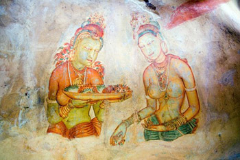 Sigiriya claims an international fame due to the historic frescoes of female Apsaras or celestial nymphs, painted in the 5th century AD, at a height of about 100 meters above the ground on the rock face. The paintings are in the form of a band of length 140 meters. Some scholars and historians defined these celestial nymphs as “lightening princesses” or “cloud damsels”.